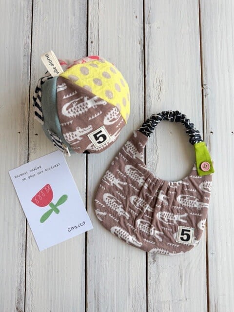 帽子とスタイ(よだれかけ)、メッセージカードがセットになっています。